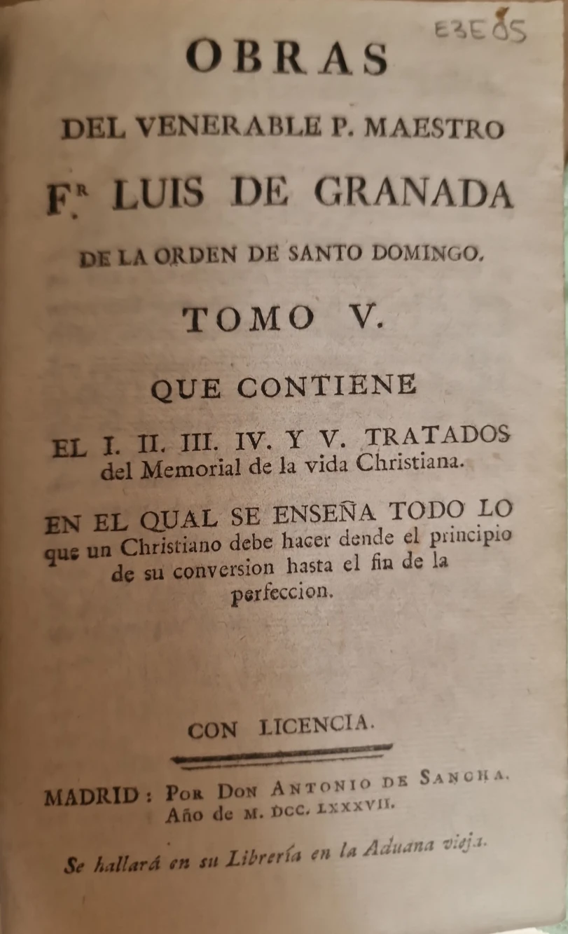 Título: Obras del venerable P. Maestro Fr. Luis de Granada de la Orden de Santo Domingo. Tomo Quinto