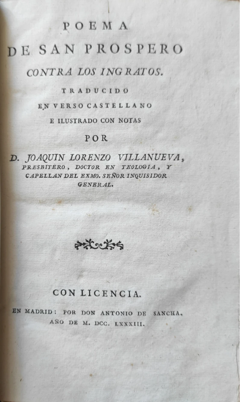 Portada libro : Poema de San Próspero contra los ingratos. Traducido en verso castellano é ilustrado con notas por ...
