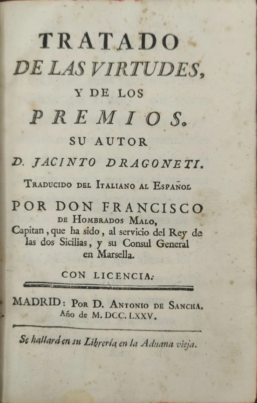 Portada libro : Tratado de las virtudes y de los premios. Su autor D. Jacinto Dragoneti. Traducido del italiano al e....