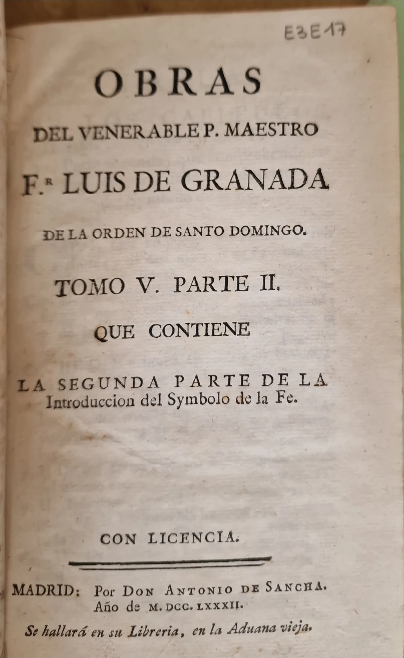 Título: Obras del venerable P. Maestro Fr. Luis de Granada de la Orden de Santo Domingo. Tomo Diecisieteavo