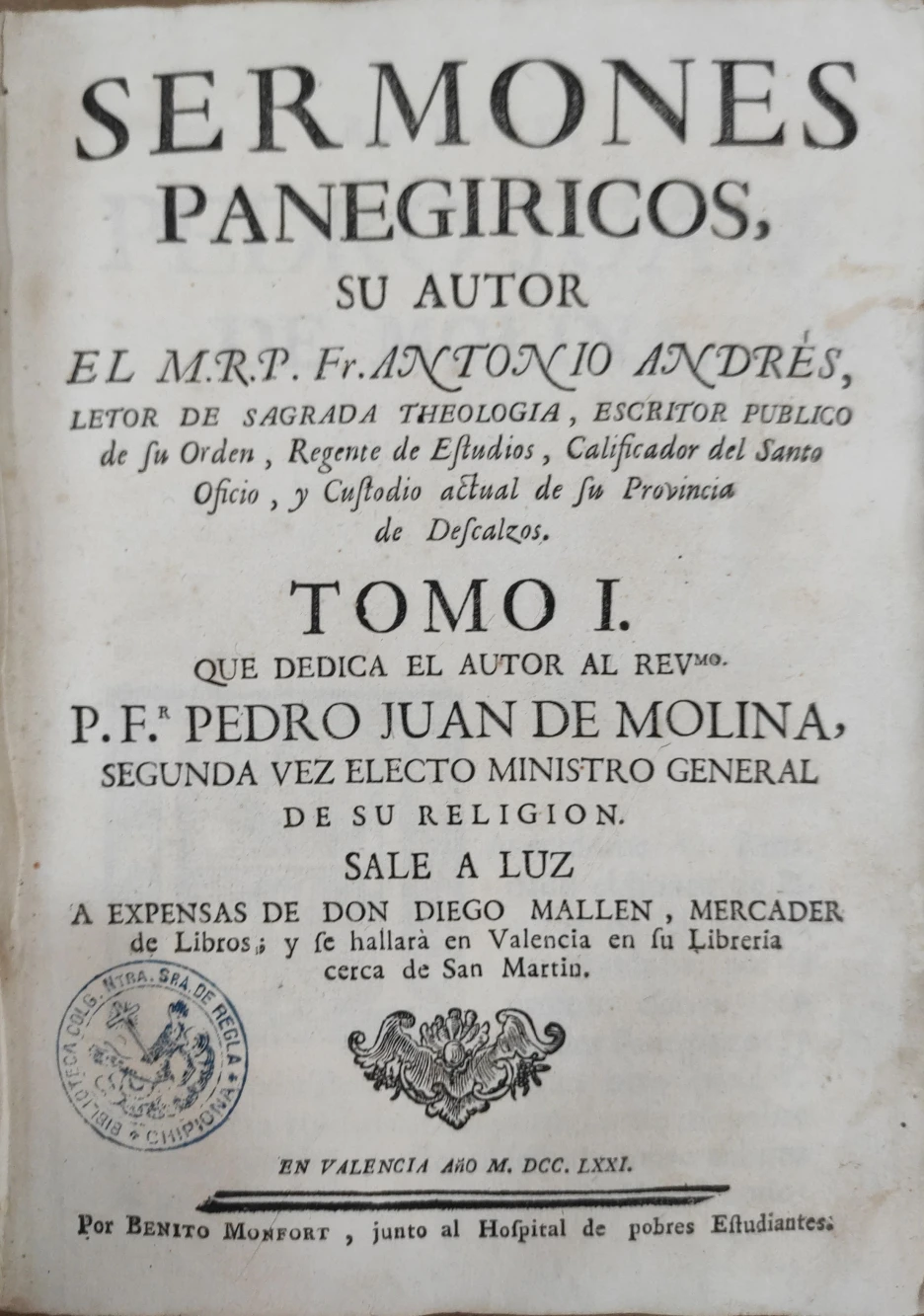 Título: Sermones panegiricos, su autor el M.R.P. Fr. Antonio Andrés. Tomo I. Sale a luz a expensas de Don Di...