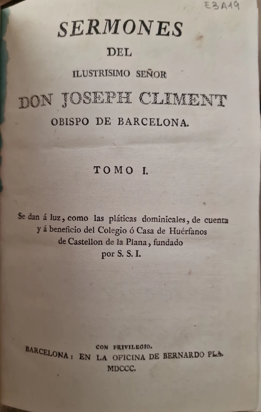 Título: Sermones del ilustrísimo señor don Joseph Climent, obispo de Barcelona. Tomo I