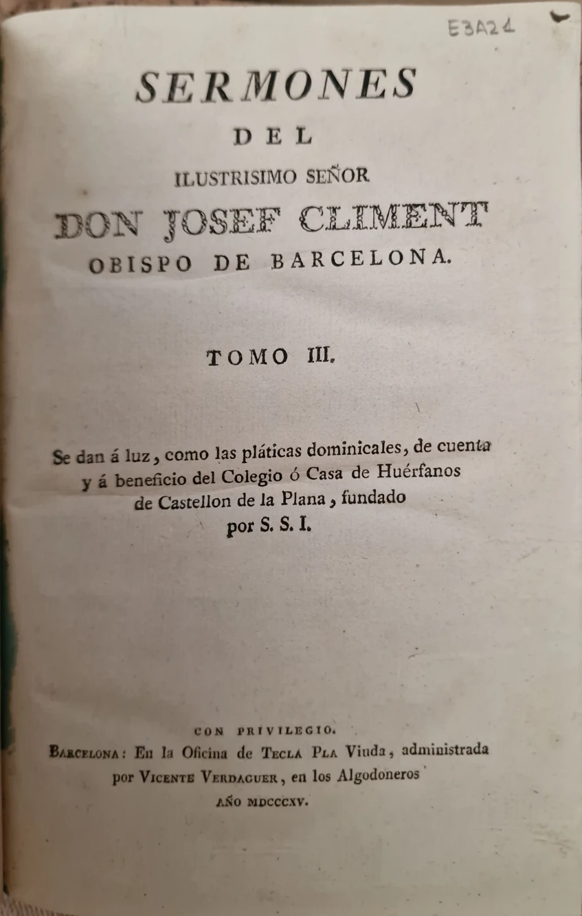 Título: Sermones del ilustrísimo señor don Joseph Climent, obispo de Barcelona. Tomo III