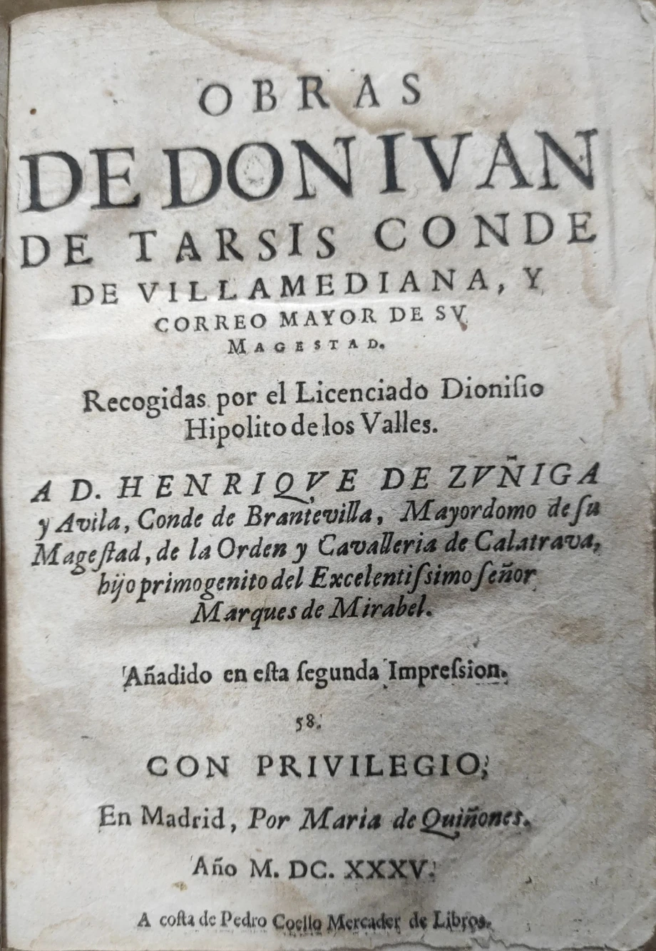 Título: Obras de don Juan de Tarsis Conde de Villamediana. Recogidas por Dionisio Hipolito de los Valles.
