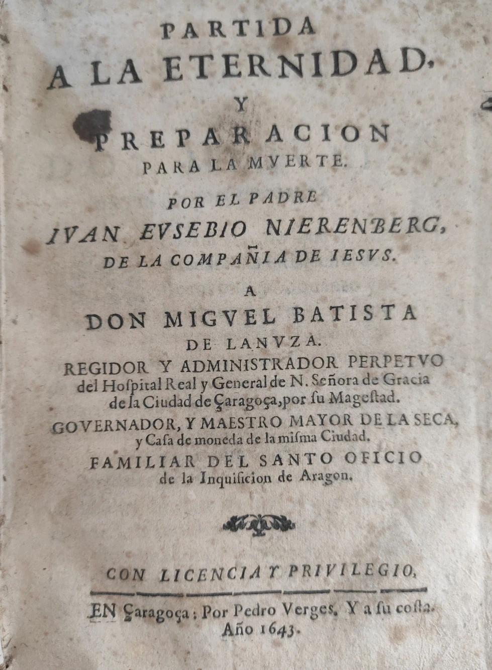 Portada libro : Partida a la eternidad y preparacion para la muerte por el padre Juan Eusebio de Nieremberg, de la C....