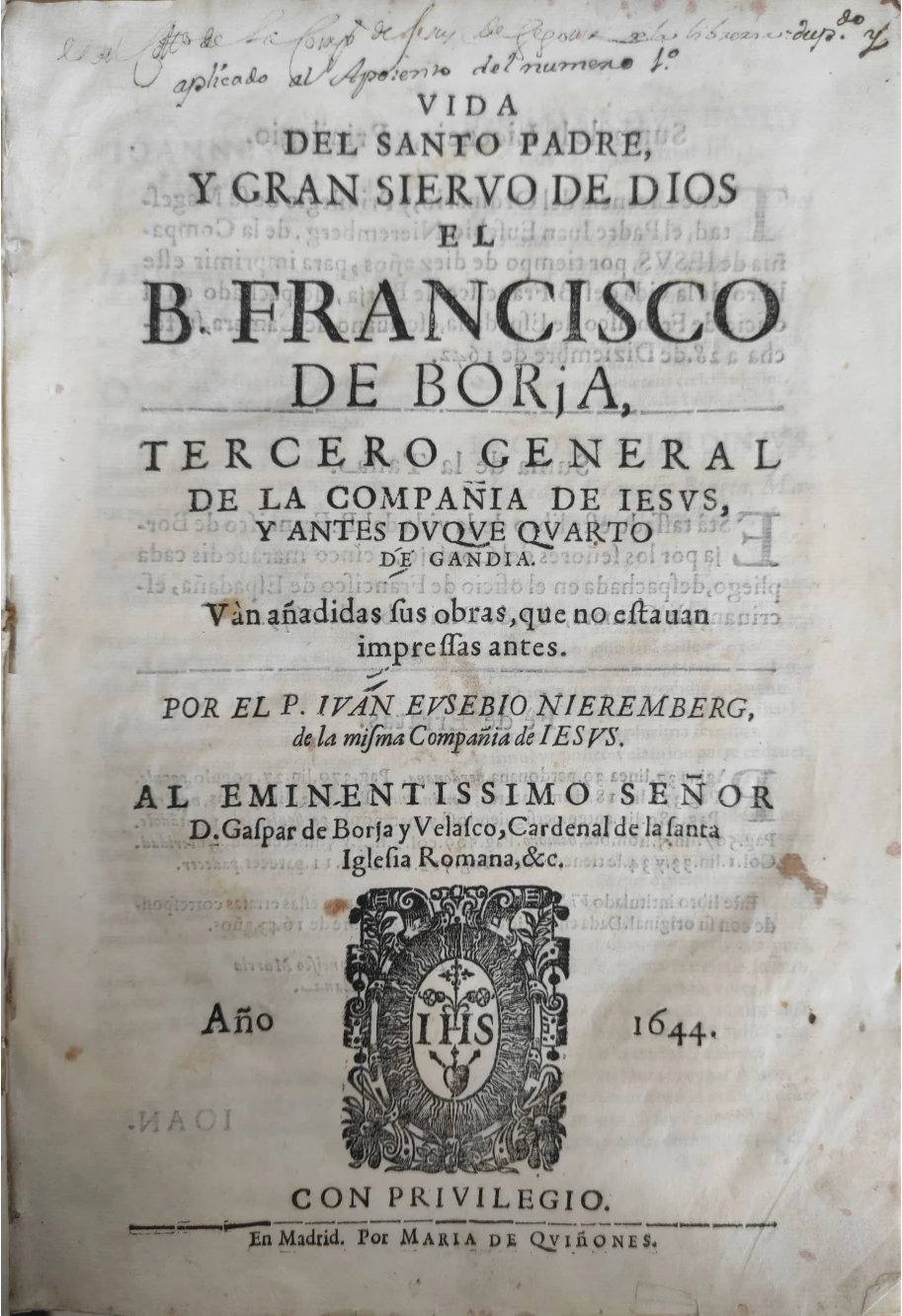 Título: Vida del santo padre, y gran siervo de Dios el B. Francisco de Borja, tercero general de la Compañía...