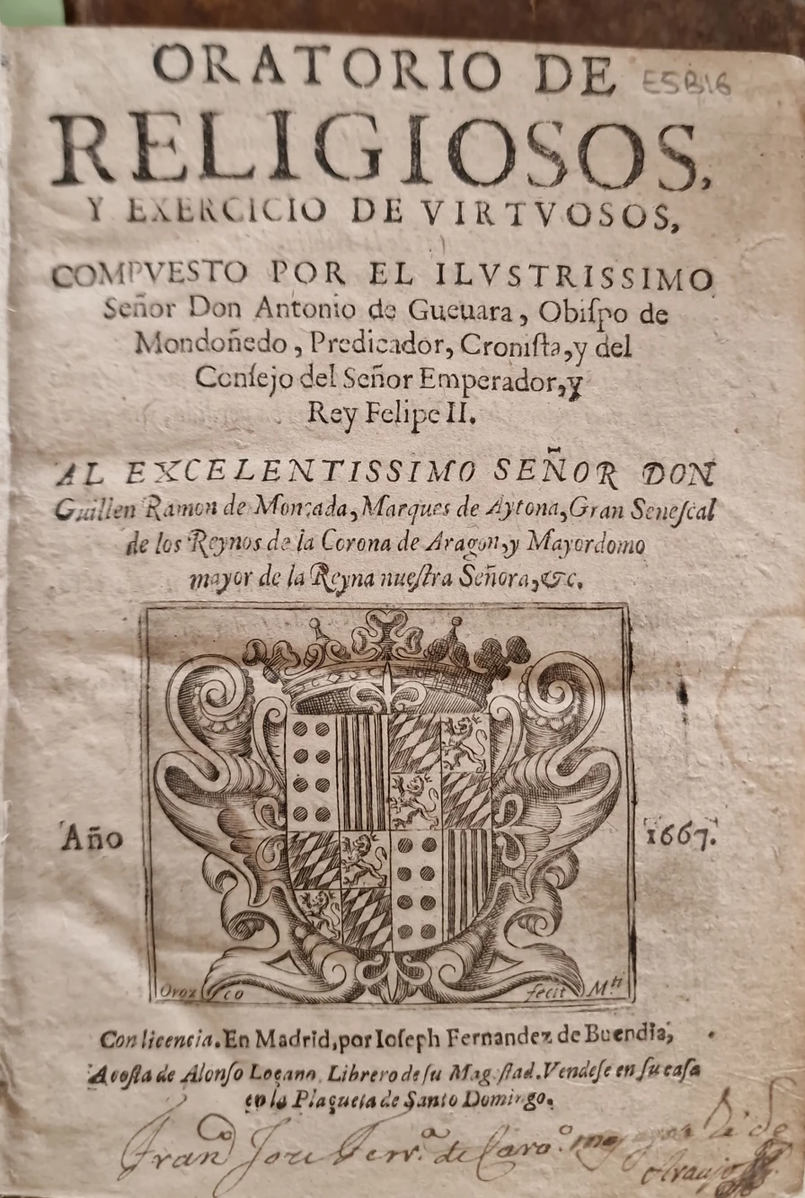 Título: Oratorio de religiosos, y exercicio de virtuosos. Compuesto por el ilustrísimo Don Antonio de Guevar...