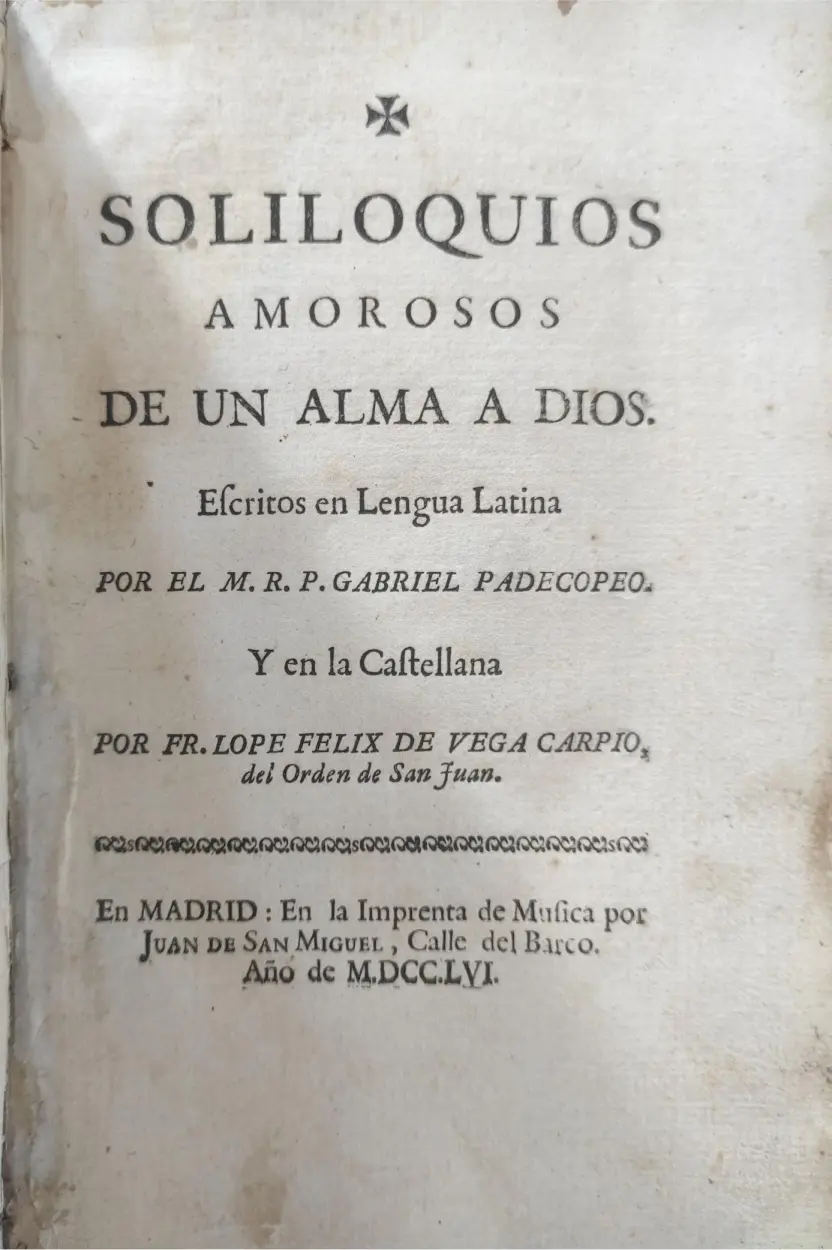 Título: Soliloquios amorosos de un alma a Dios. Escritos en lengua latina por el M. R. P. Gabriel Padecopeo....