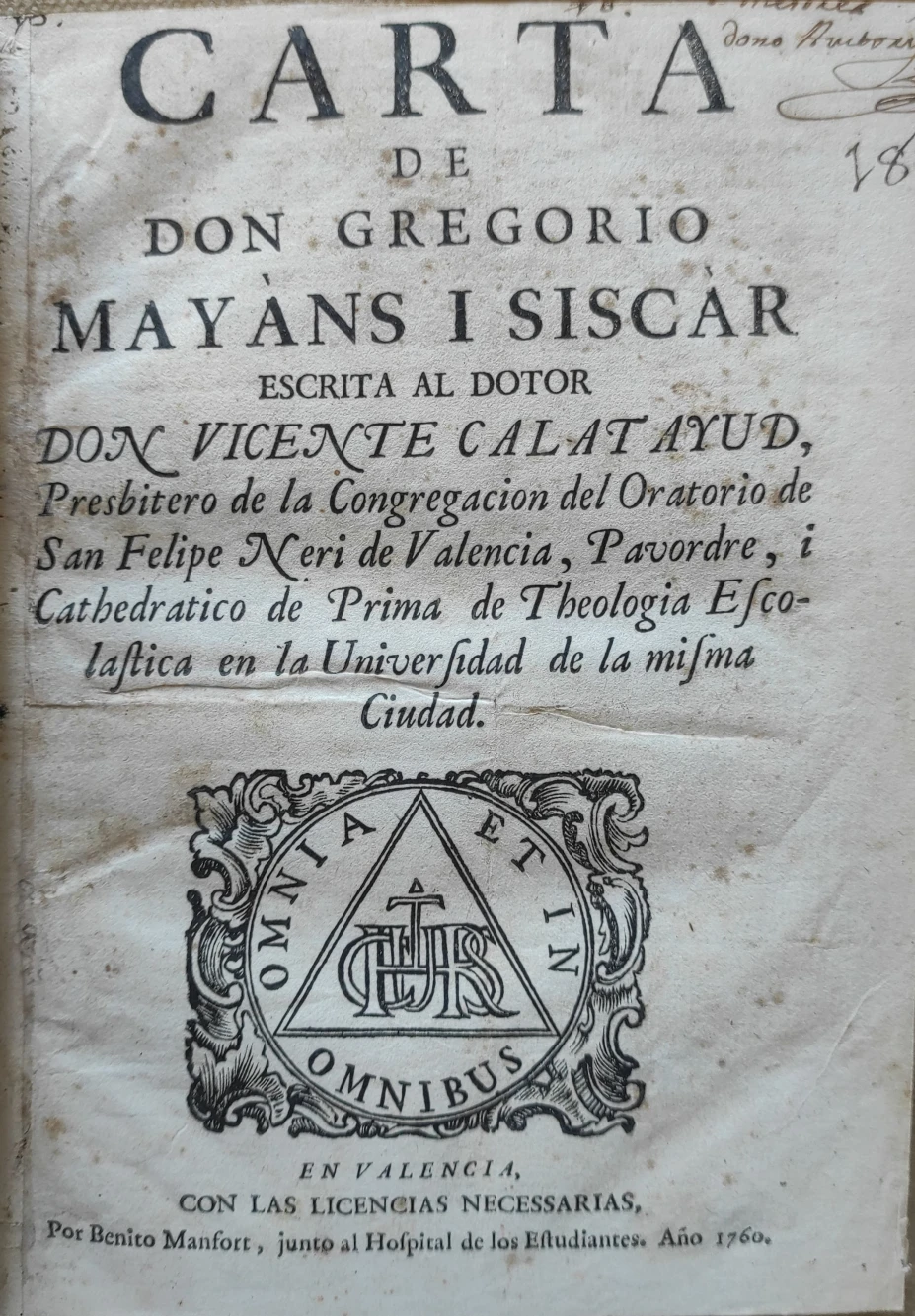 Título: Carta de don Gregorio Mayàns i Siscàr, escrita al doctor don Vicente Calatayud. Presbitero de la Con...