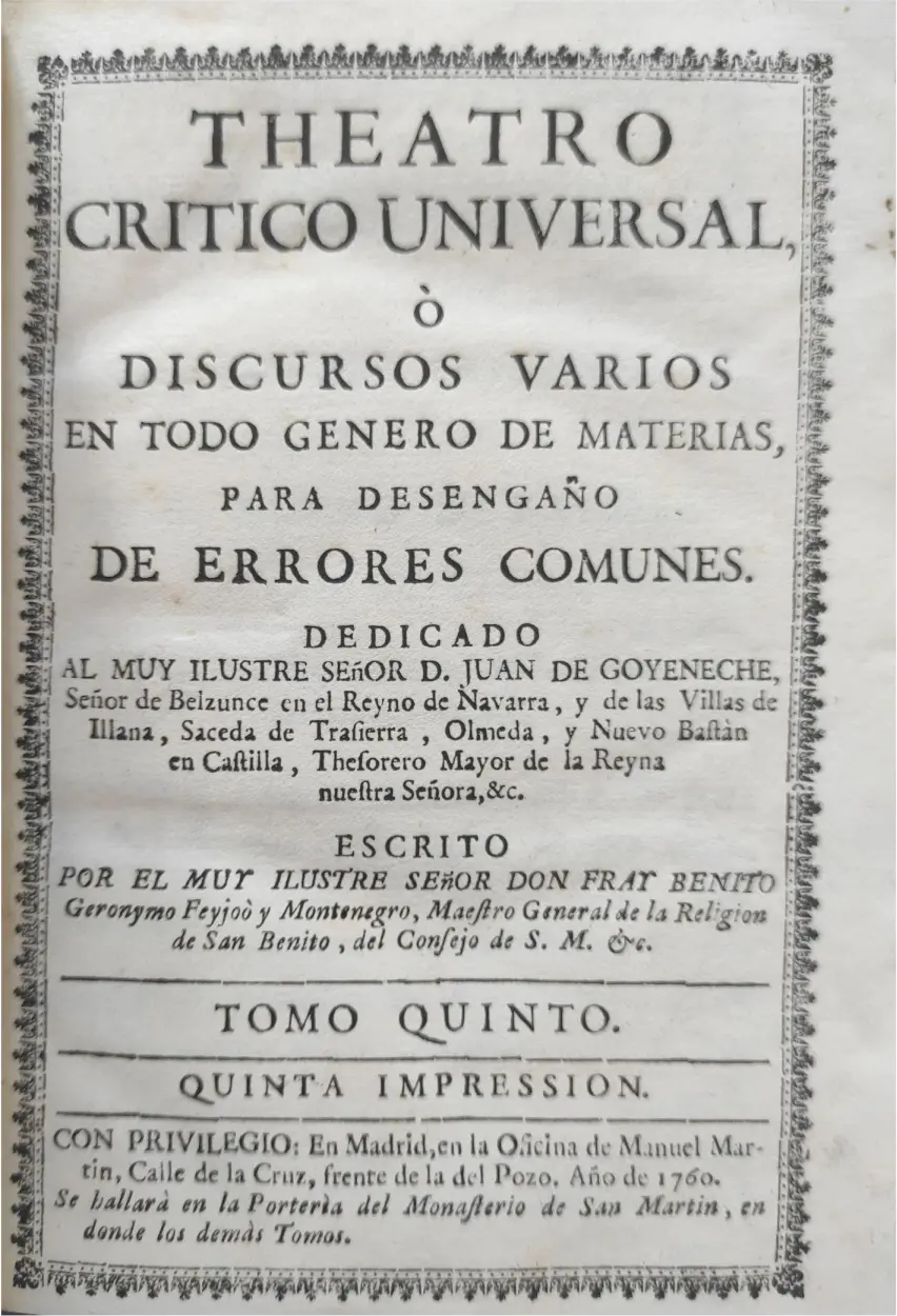 Título: Teatro crítico universal, ó discursos varios en todo genero de materias, para desengaño de errores c...