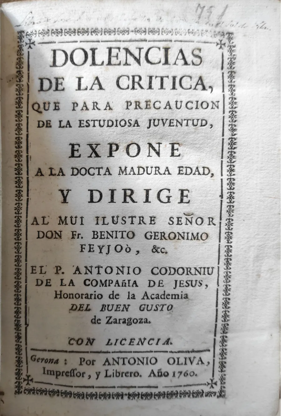 Título: Dolencias de la crítica, que para precaución de la estudiosa juventud. Expone y Dirige Antonio Codor...