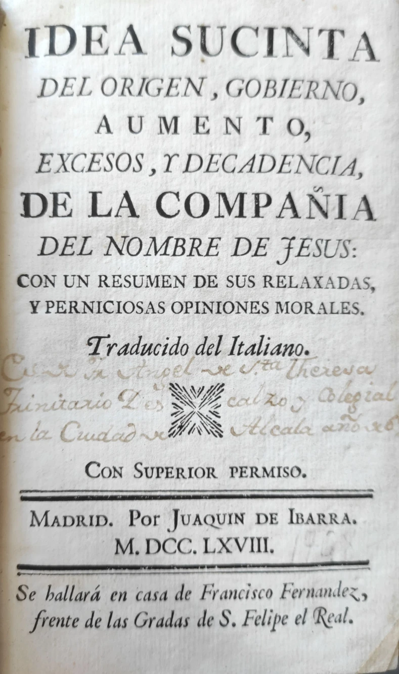 Título: Idea sucinta del origen, gobierno, aumento, excesos, y decadencia. De la Compañia del nombre de Jesú...