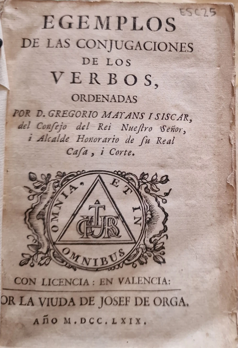 Título: Egemplos de las conjugaciones de los verbos, ordenadors por D. Gregorios Mayans i Siscar