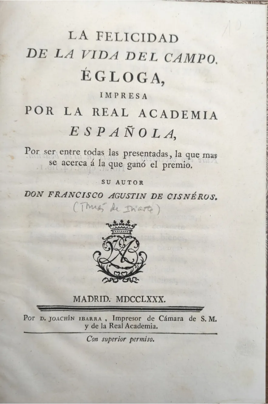 Título: La felicidad de la vida del campo : égloga impresa por la Real Academia Española, por ser entre toda...