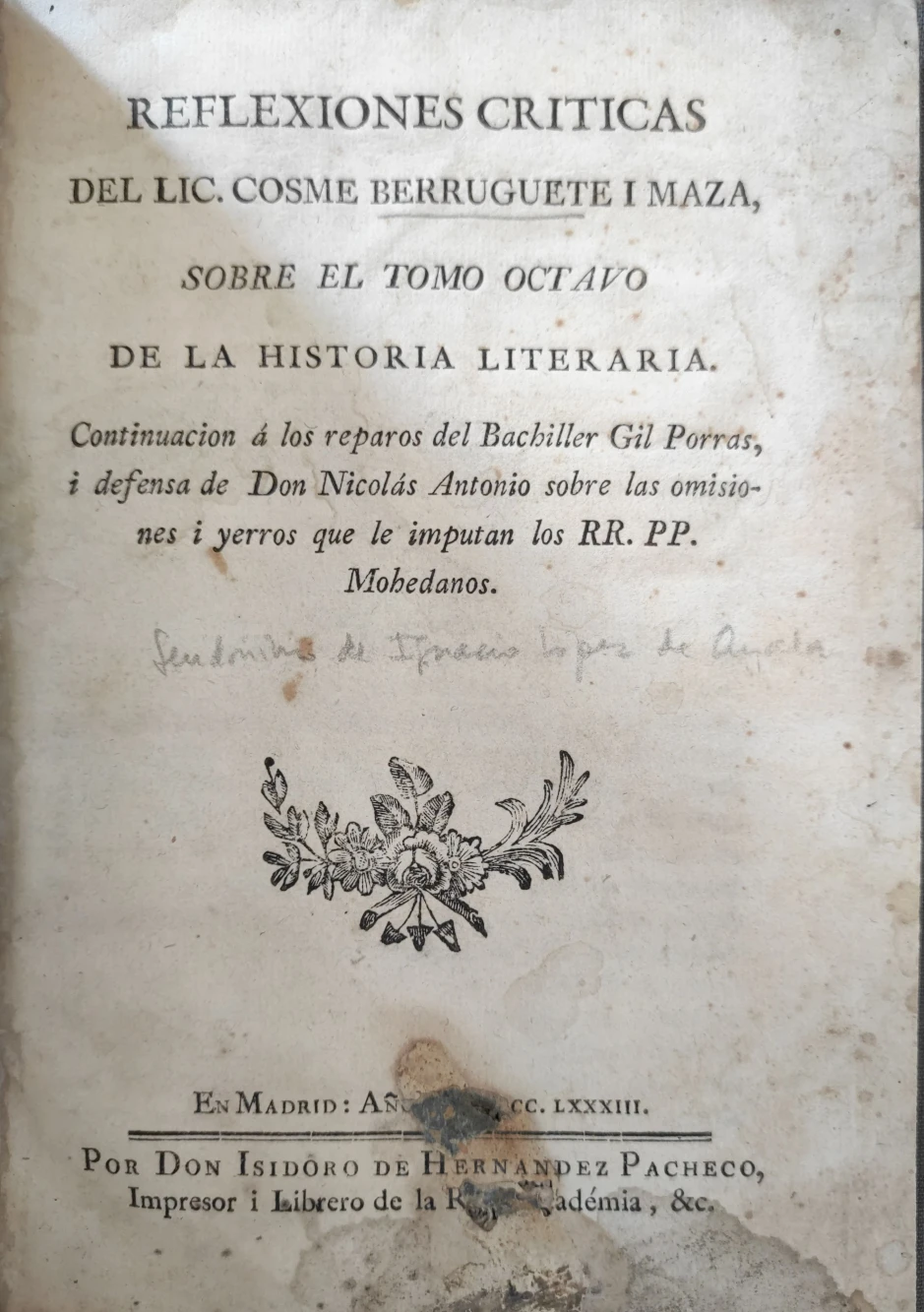 Título: Reflexiones críticas del Lic. Cosme Berruguete i Maza sobre el tomo octavo de la Historia literaria....