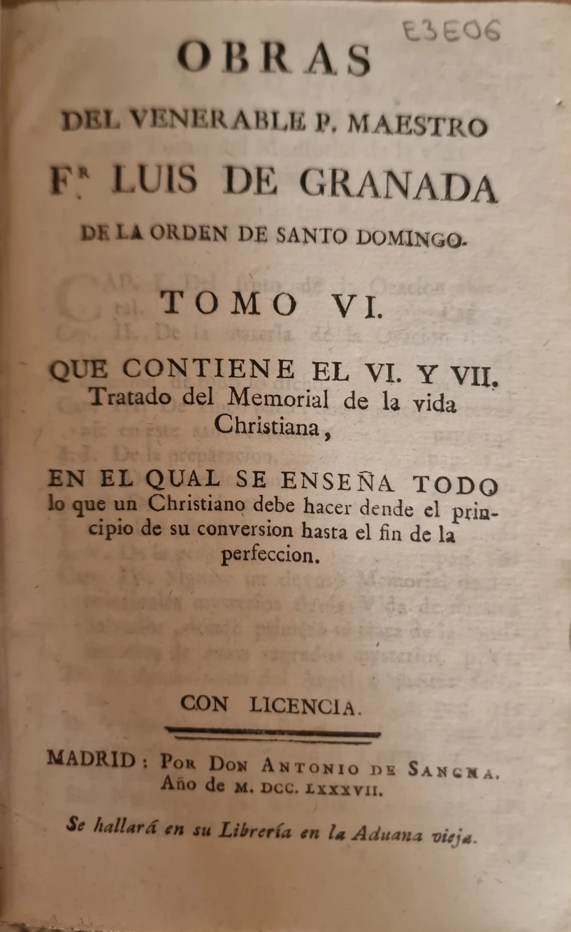 Título: Obras del venerable P. Maestro Fr. Luis de Granada de la Orden de Santo Domingo. Tomo Sexto