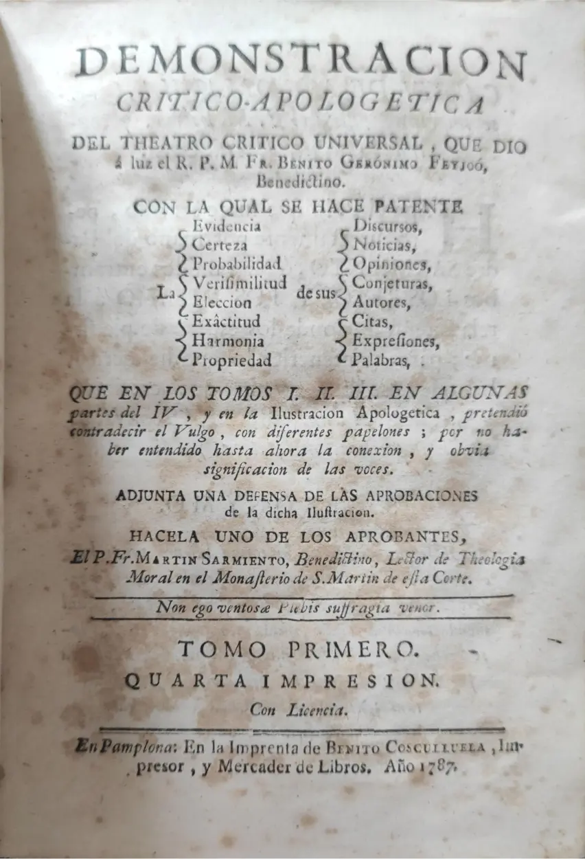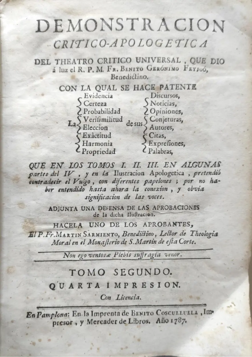 Título: Demostración Crítico-Apologética, del Teatro Crítico Universal, que dio á luz el R. P. M. Fr. Benito...