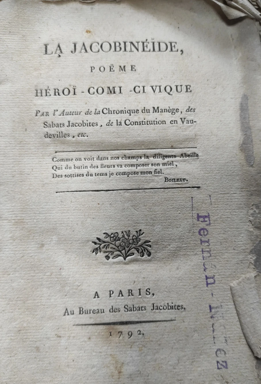 Título: La Jacobinéïde. Poëme, Héroï - Comi - Ci Vique. Par l' Auteur de la Chronique du Manège, des Sabats ...