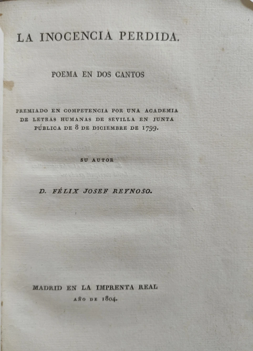 Título: La inocencia perdida. Poema en dos cantos premiado en competencia por una Academia de Letras humanas...