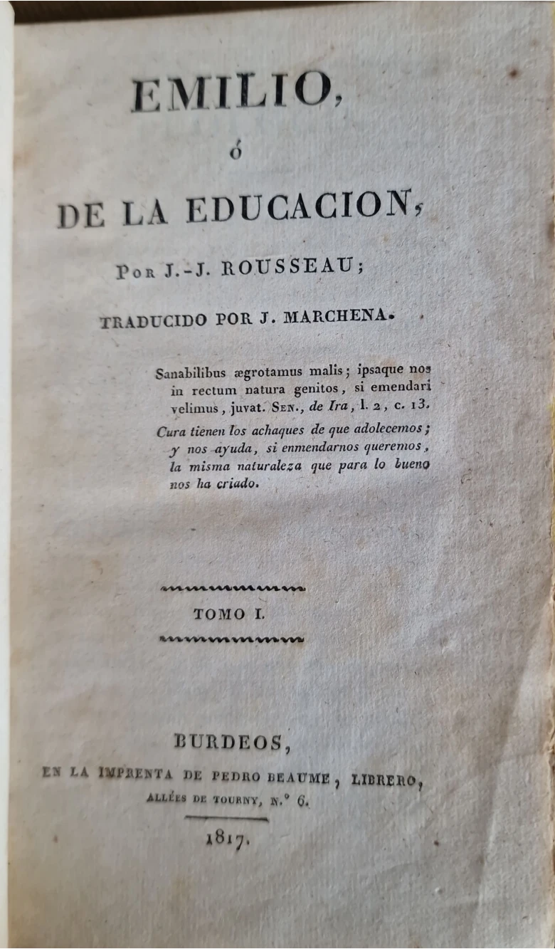 Título: Emilio ó La educación, por J. J. Rousseau. Traducido por J. Marchena. Tomo I.