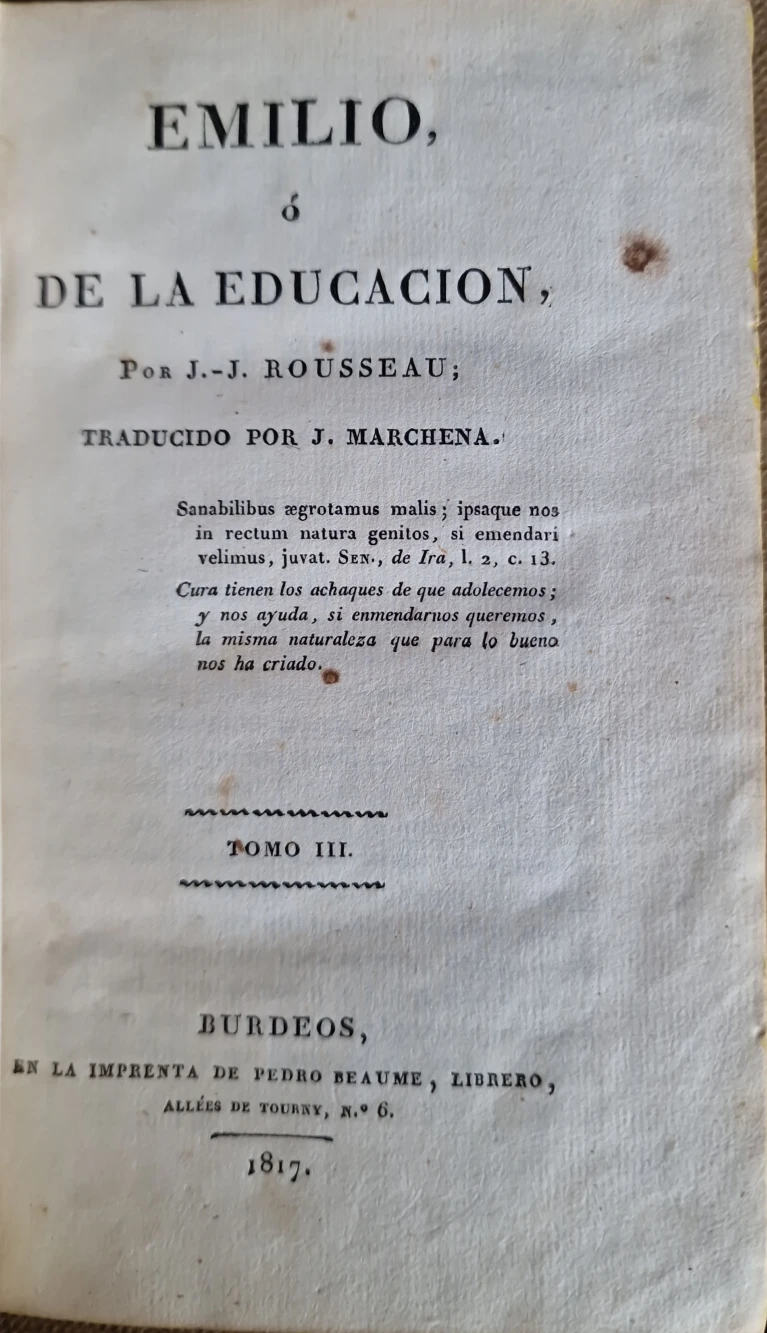 Título: Emilio ó La educación, por J. J. Rousseau. Traducido por J. Marchena. Tomo III.