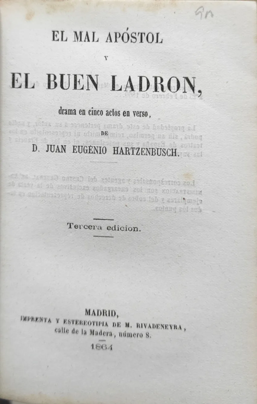 Título: El mal apóstol y el buen ladron Drama en cinco actos, en verso / de D. Juan Eugenio Hartzenbusch