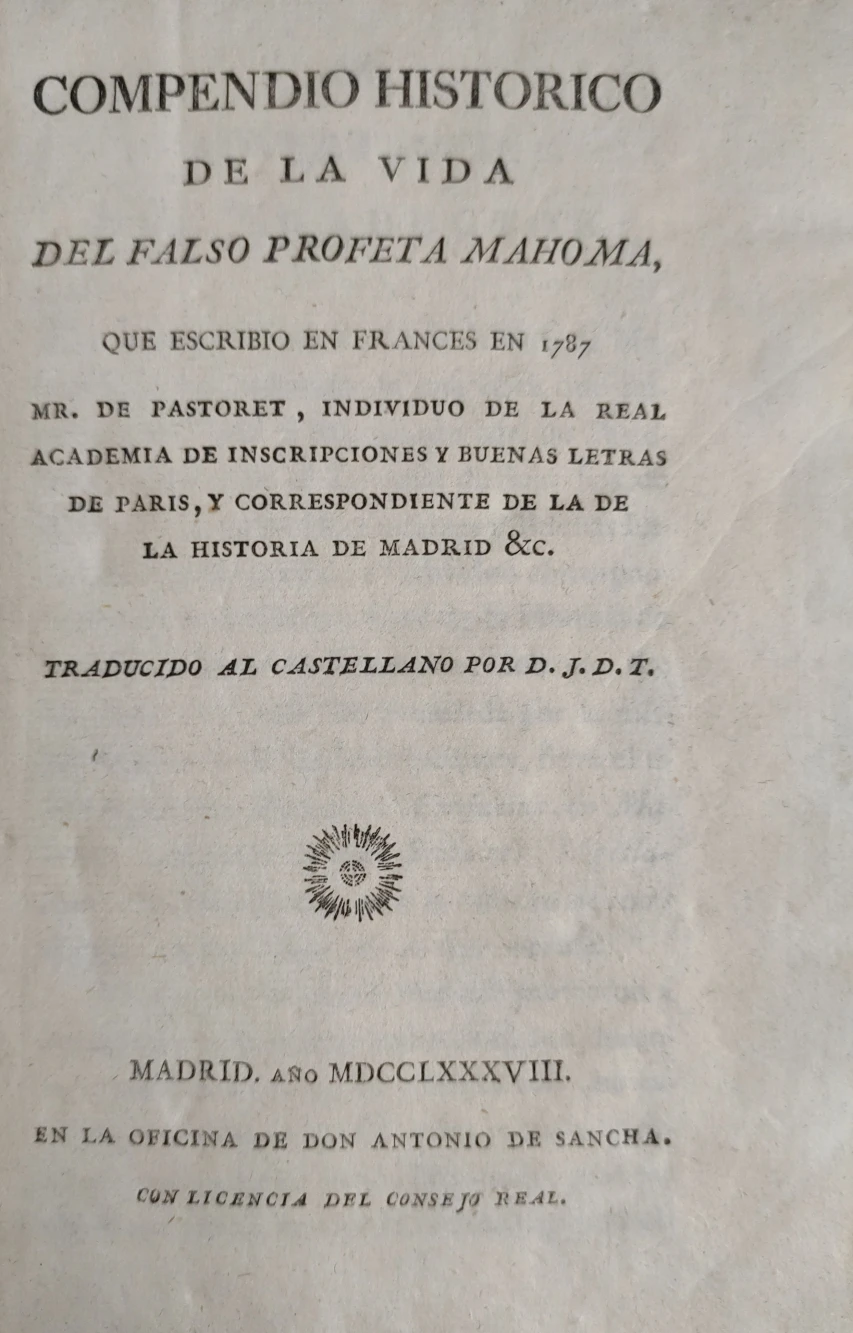 Título: Compendio histórico de la vida del falso profeta Mahoma que escribió en francés en 1787 Mr. de Pasto...